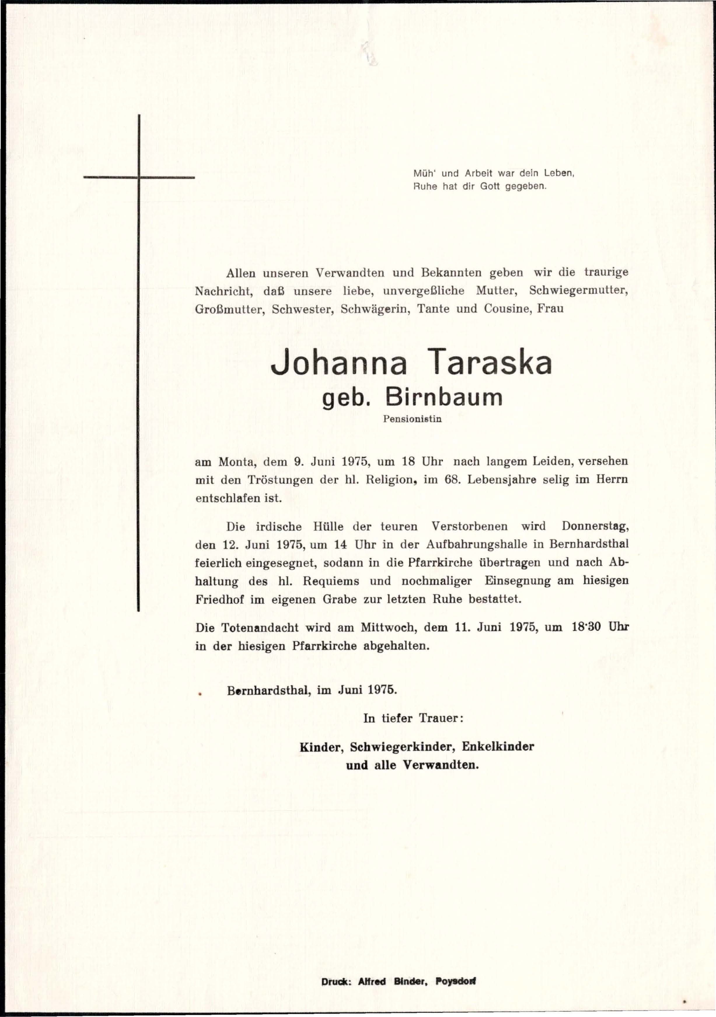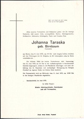 11 Taraska Johanna (Birnbaum) Brunnengasse 327 - ~*1907 +09.06.1975 |