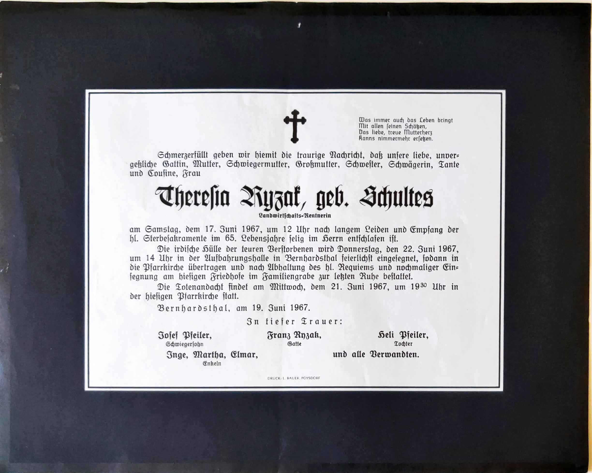 16 Ryzak Theresia (Schultes) Am Schloßberg 51 - ~*1902 +17.06.1967 |