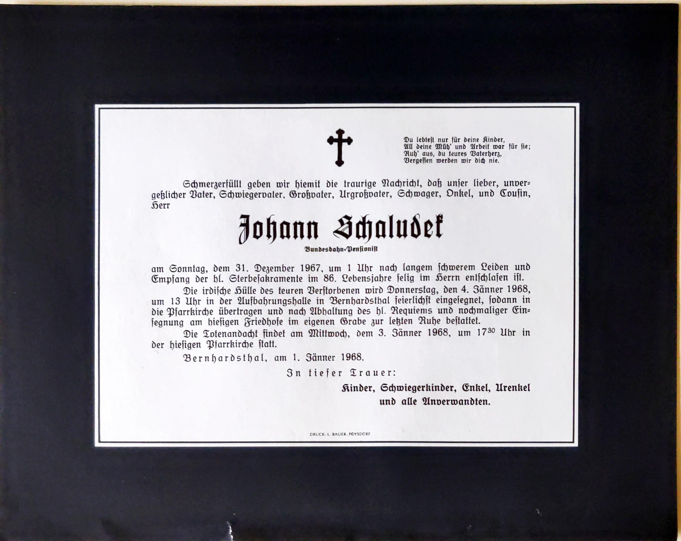 25 Schaludek Johann Meierhofgasse 301 - ~*1882 +31.12.1967 |