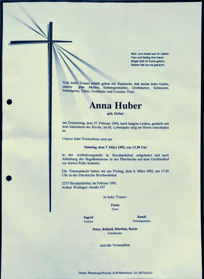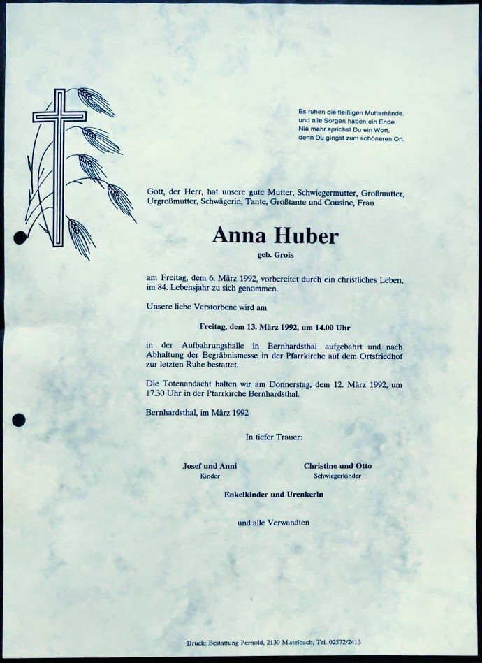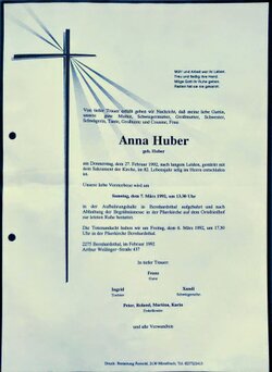Huber Anna (Grois) Teichstraße 265 - ~*1908 +06.03.1992 |