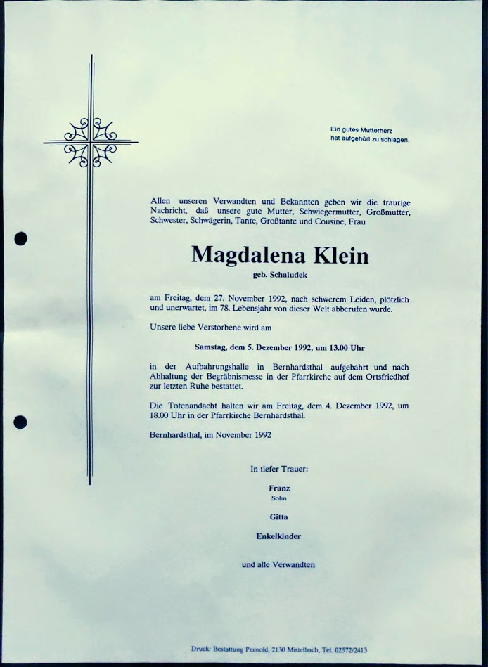 Klein Magdalena (Schaludek) Meierhofgasse 301 - ~*1914 +27.11.1992 |