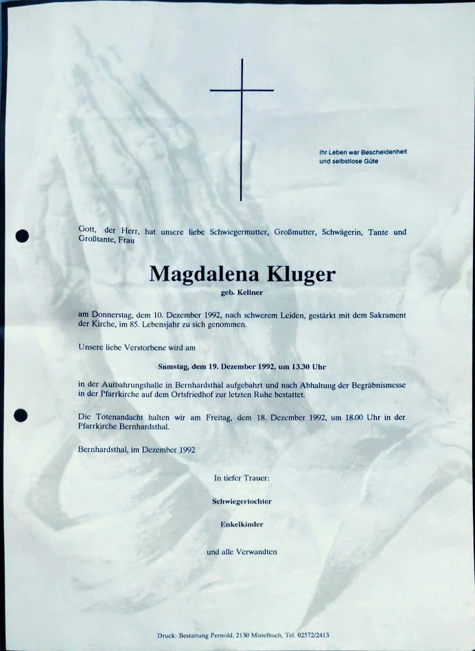 Kluger Magdalena (Kellner) Hauergasse 27 - ~*1908 +10.12.1992 |