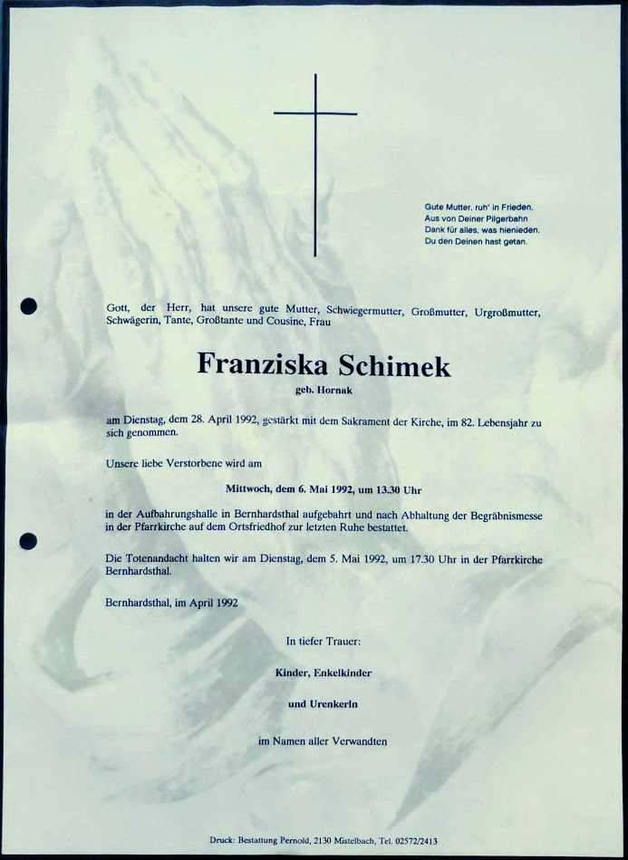Schimek Franziska (Hornak) Teichstraße 454 - ~*1910 +28.04.1992 |