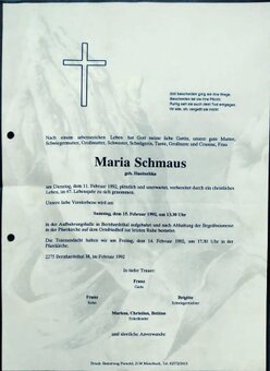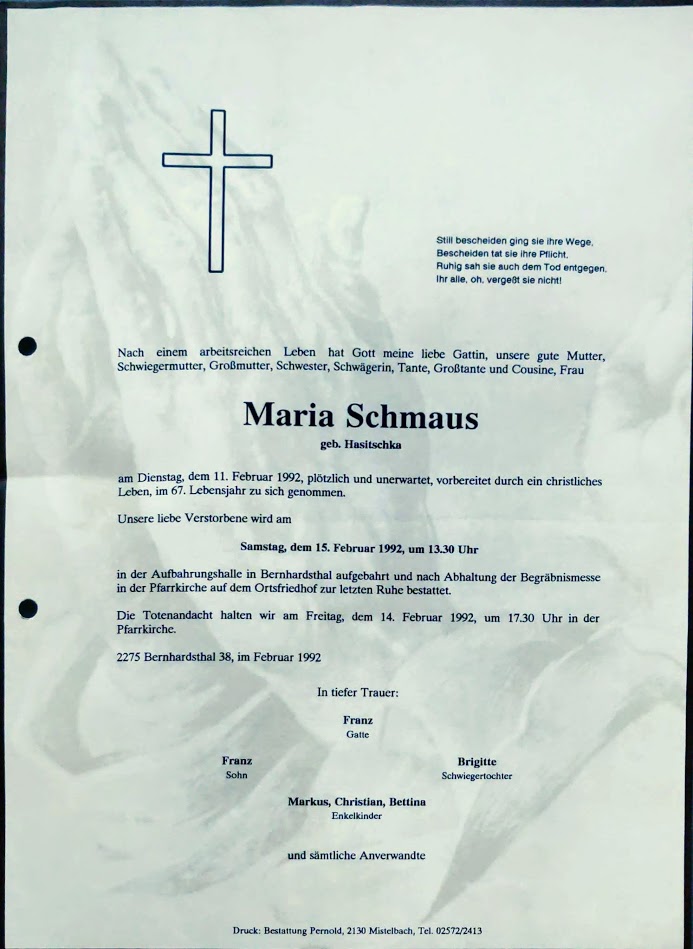 Schmaus Maria (Hastschka) Hauergasse 38 - ~*1925 +11.02.1992 |