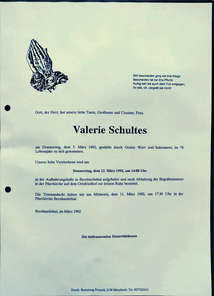 Schultes Valerie Hauptstraße 105 - ~*1914 +05.03.1992 |