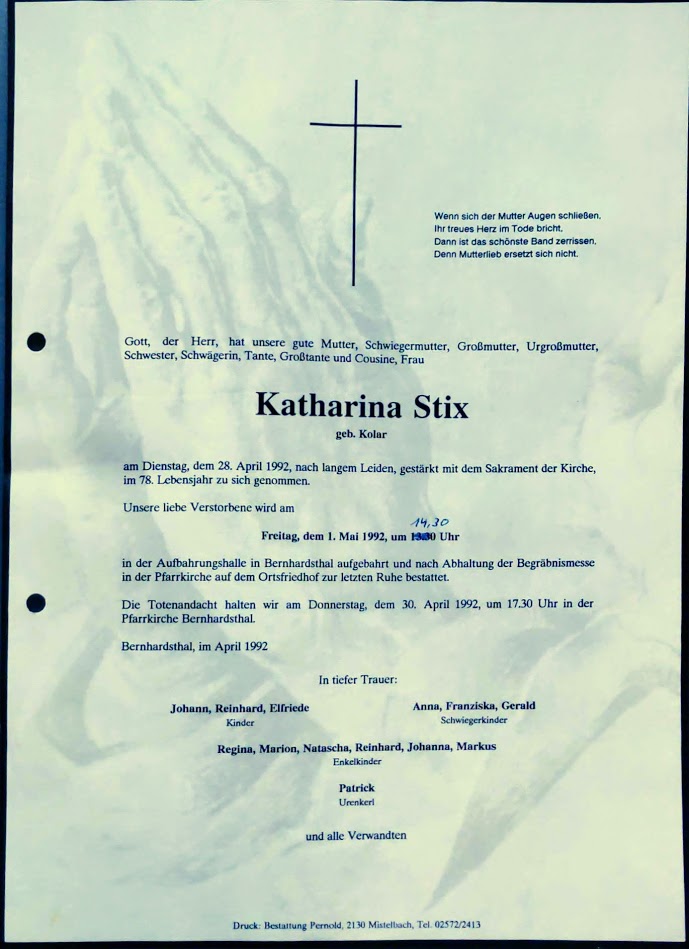 Stix Katharina (Kolar) Mühlbergstraße 225 - ~*1915 +28.04.1992 |