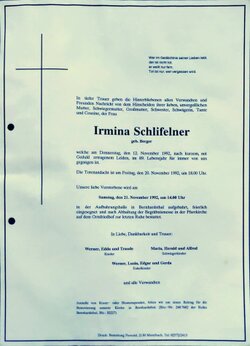Schlifelner Irmina (Berger) Friedhofstraße 336 - ~*1904 +12.11.1992 |