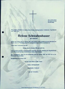 Schwabenbauer Helene (Darmovzal) Mühlbergstraße 164 - ~*1896 +14.02.1992 |