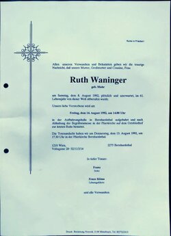 Waninger Ruth (Mahr) Josefgasse 412 - ~*1932 +08.08.1992 |